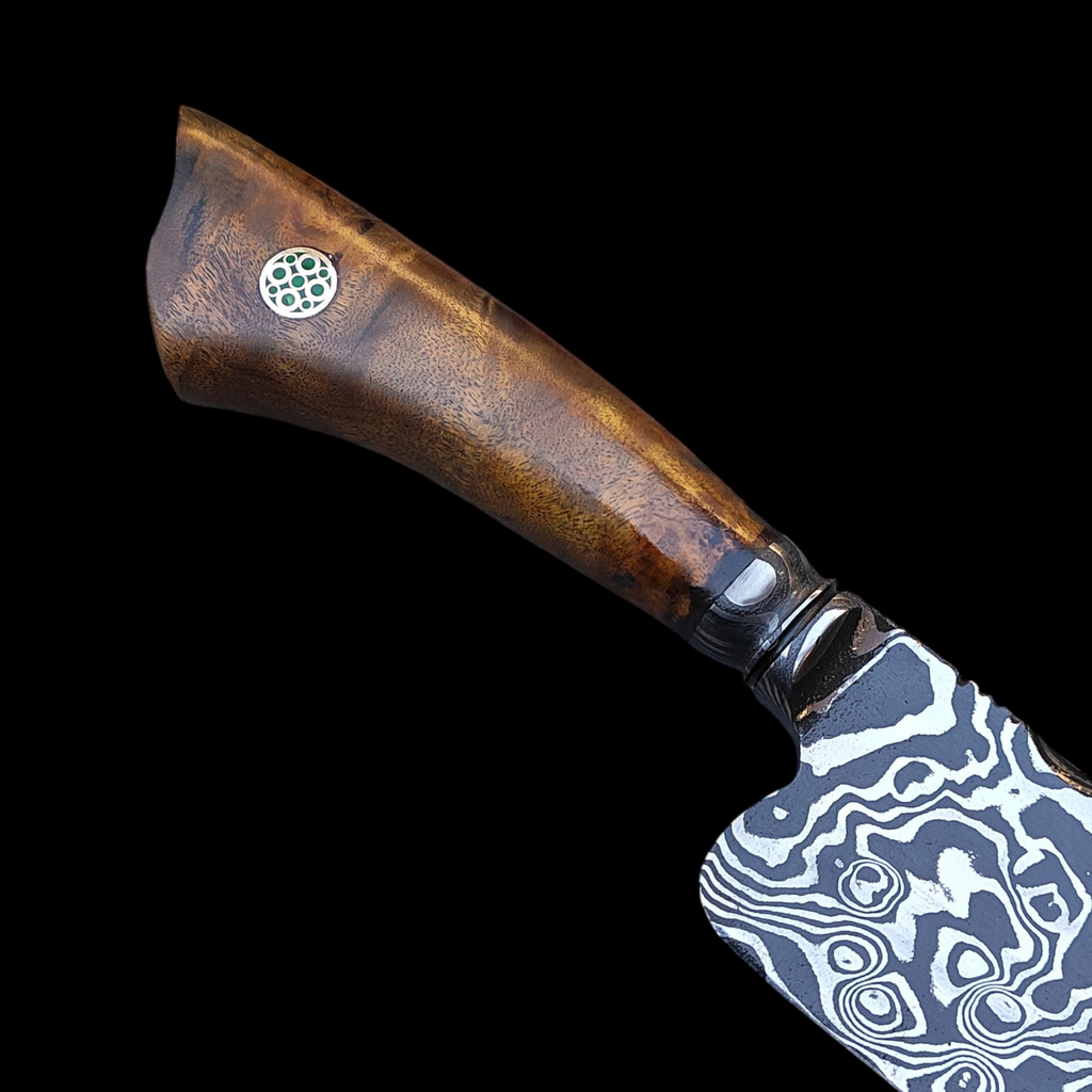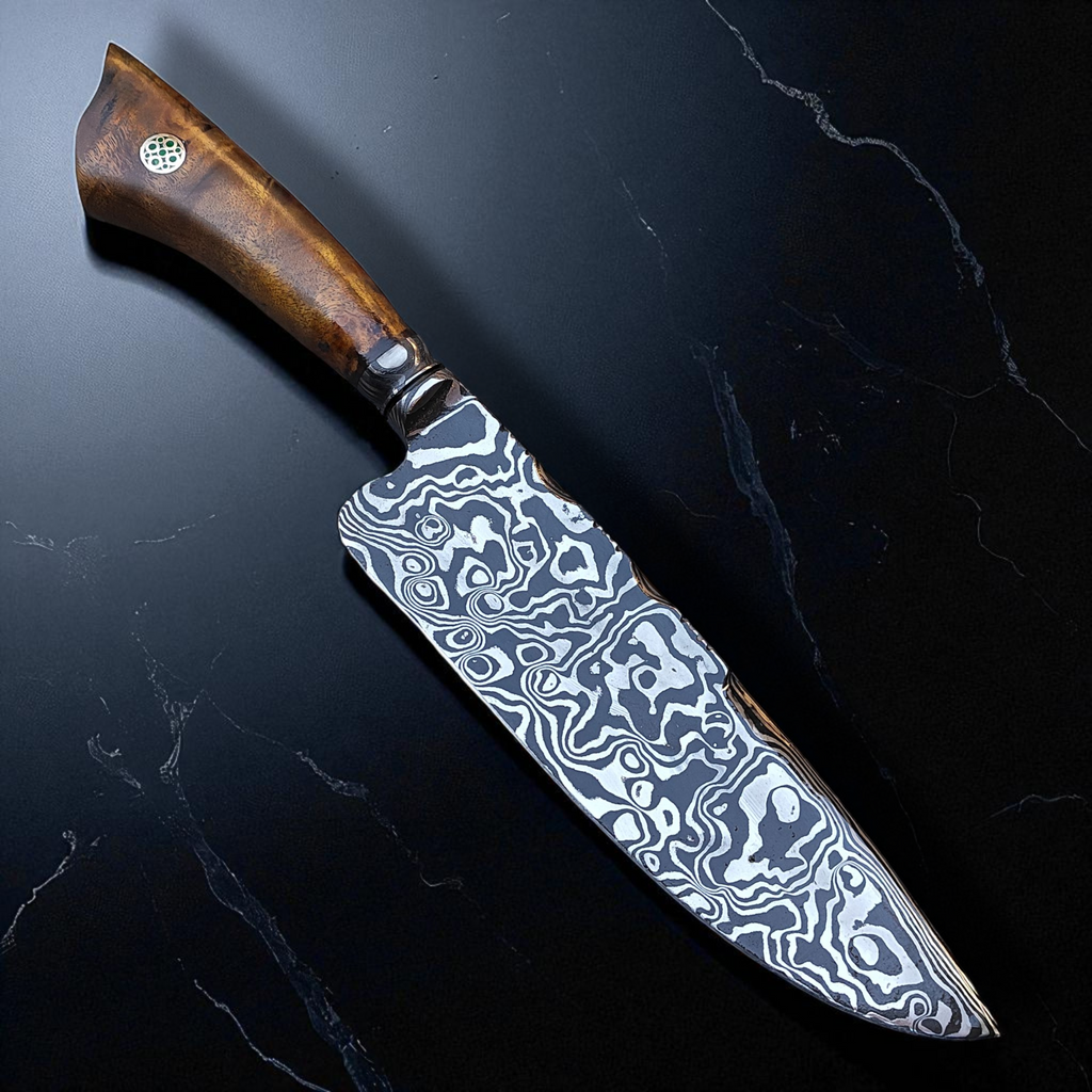 Uma faca artesanal em aço damasco de alto contraste, padrão RALEATORIO, com 10 polegadas de lâmina e 6 mm de dorso robusto.