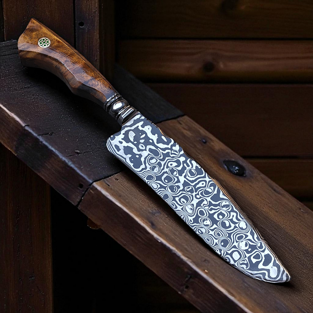 Uma faca artesanal em aço damasco de alto contraste, padrão Rain Drop, com 9 polegadas de lâmina e 6 mm de dorso robusto.