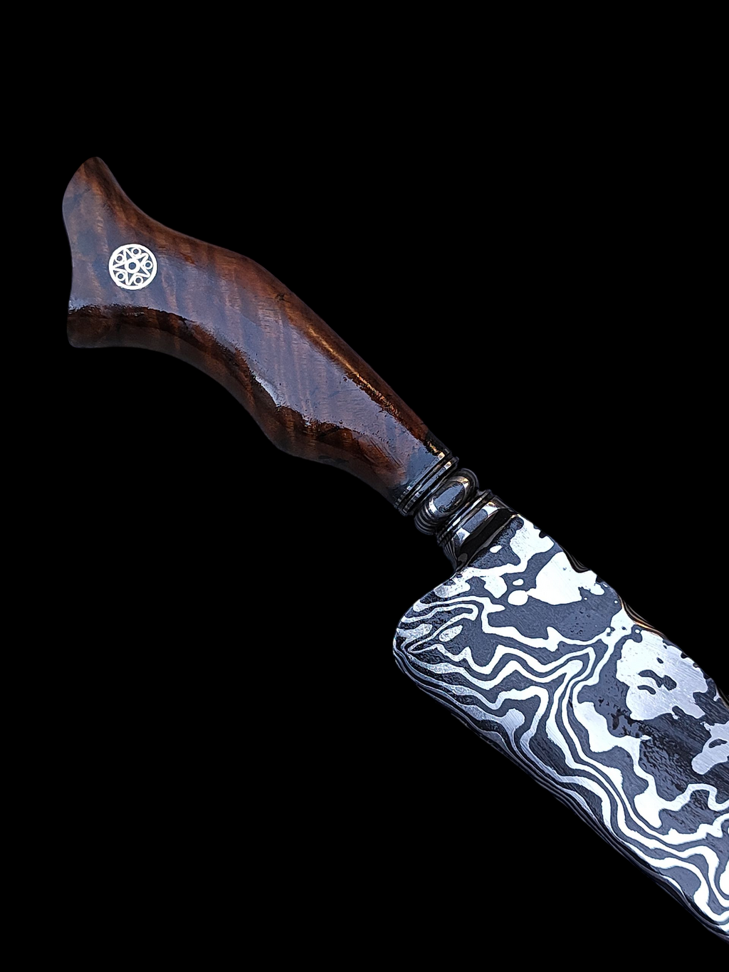 Uma faca artesanal em aço damasco de alto contraste, padrão Rain Drop, com 9 polegadas de lâmina e 6 mm de dorso robusto.