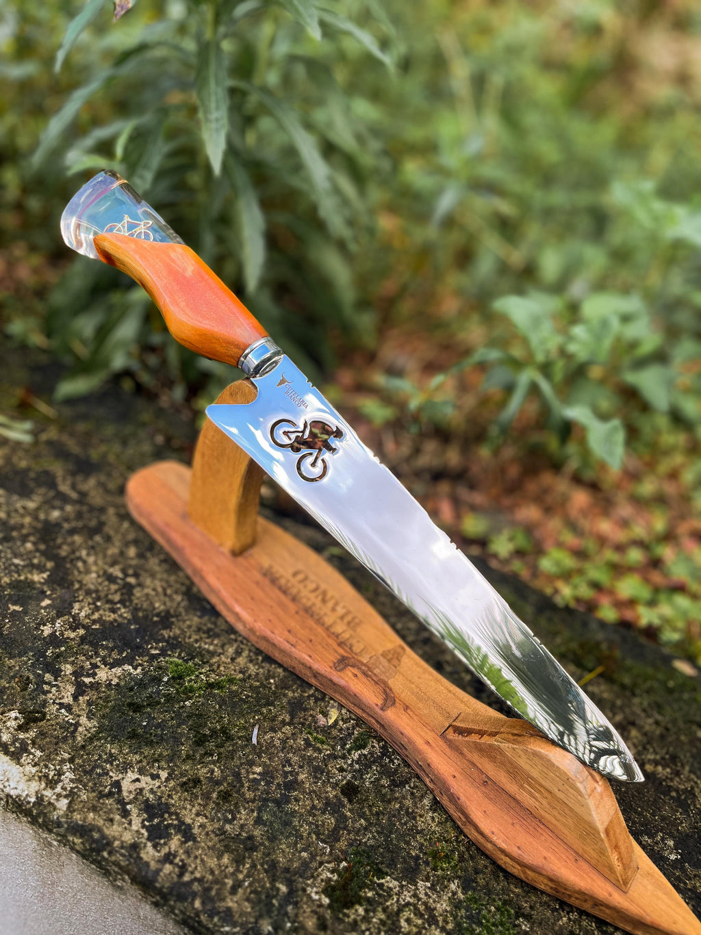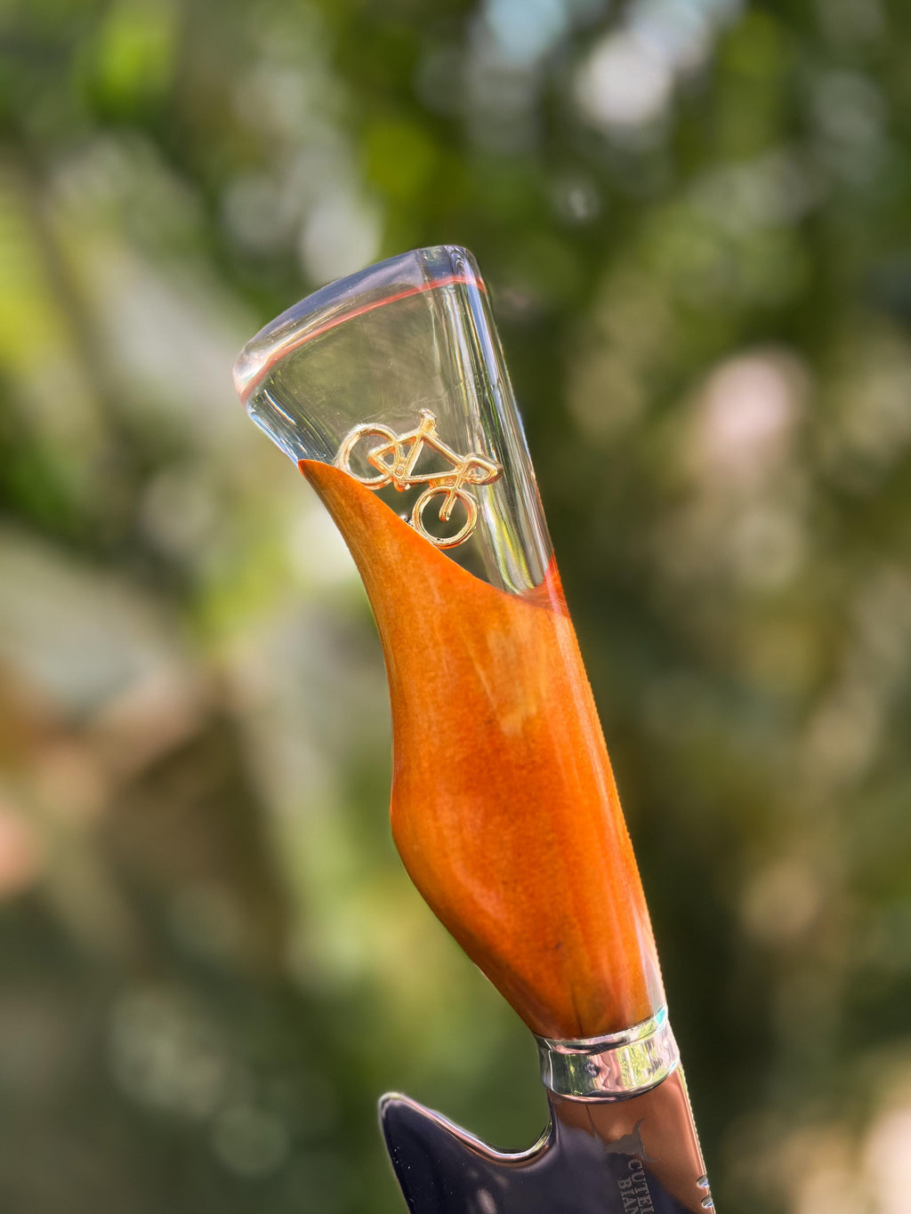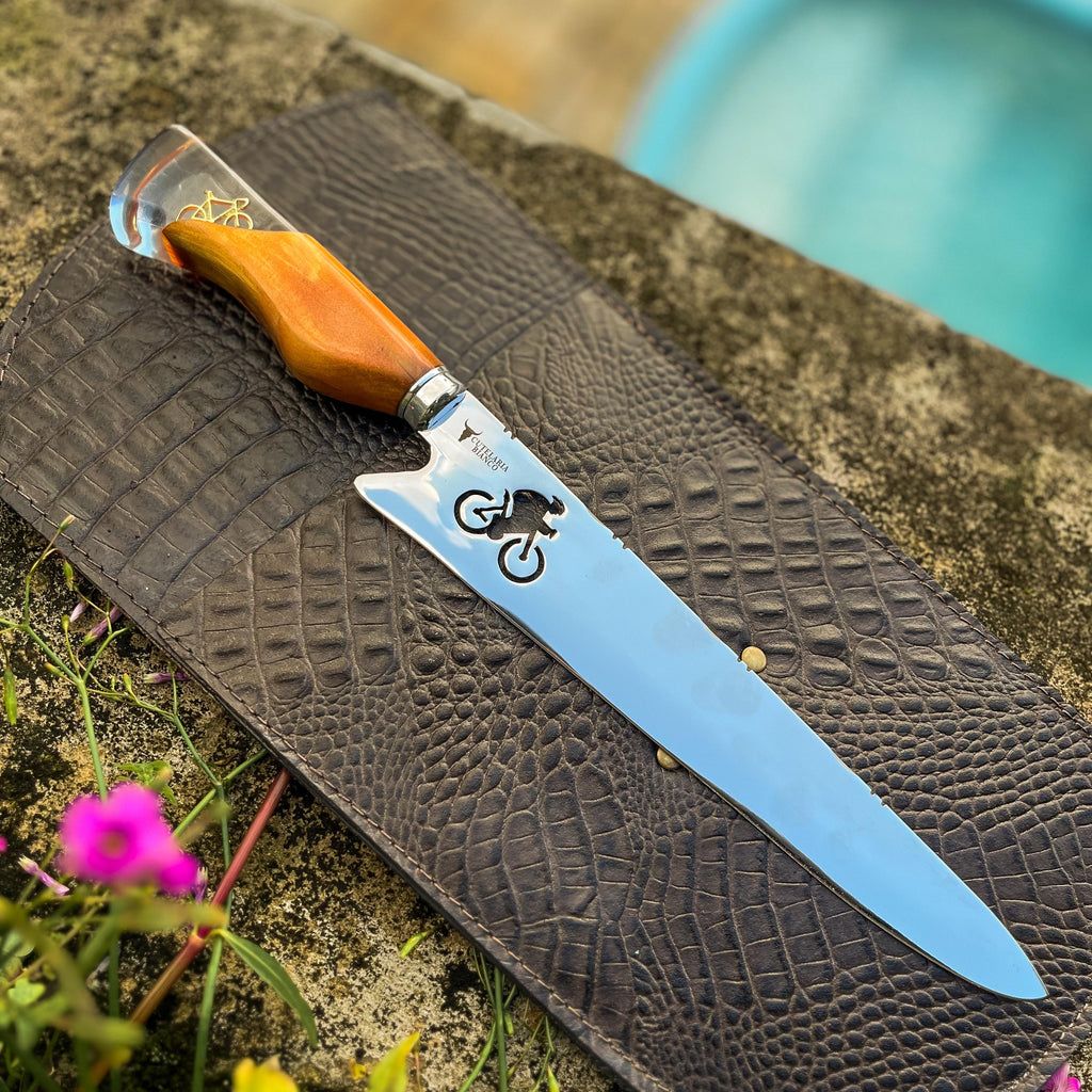 Forjada com precisão artesanal, essa faca leva consigo a liberdade das bicicletas, literalmente. Sua lâmina robusta, decorada com um vazado em forma de bike, não é apenas um detalhe, mas uma declaração. Já o cabo em cristal líquido abriga um pingente de bicicleta, um toque de sofisticação pensado para aqueles que vivem intensamente cada aventura.