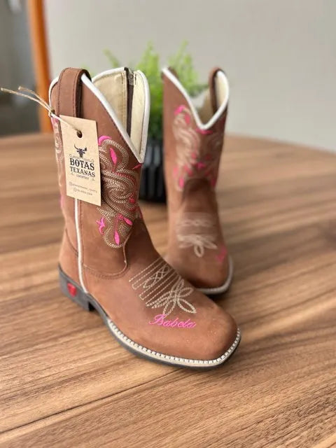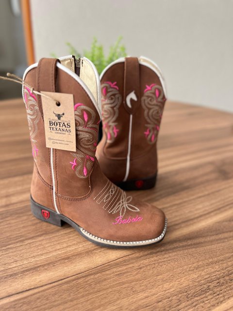 Texana Ágata Infantil - Couro Horse Nescau/Bordado Ramos Rosa