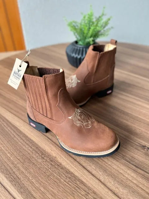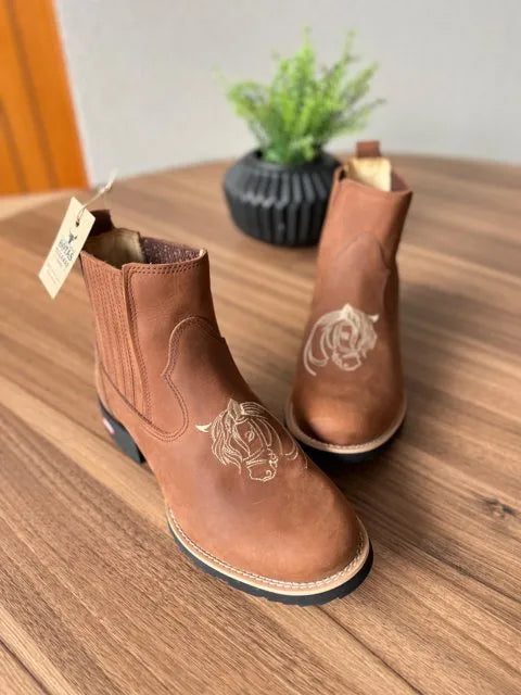 Botina Marcos - Couro Horse Nescau/ Bordado Cavalo Bege (Bico Redondo)
