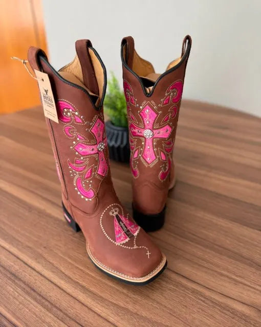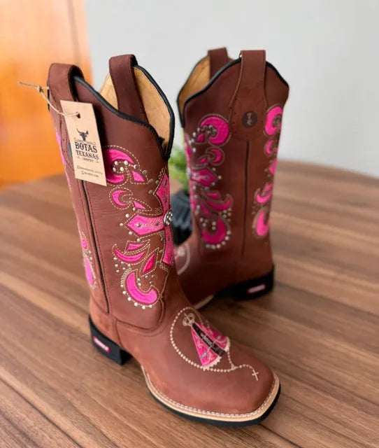 Texana Amora - Couro Horse Nescau/Bordado Cruz e Padroeira Rosa/Metais