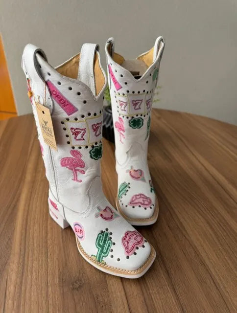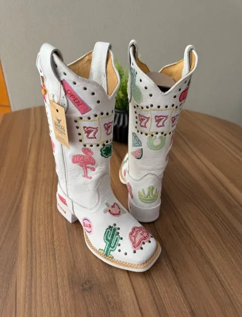 Texana Fabiana - Couro Floatter Branco/Bordado Símbolos