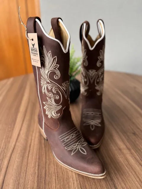 Texana Luana Bico Fino - Couro Horse Nescau/Ramos bege e Padroeira Rosa