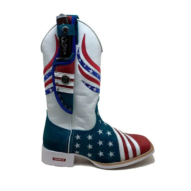 BotaFaca Americana Gold\n - Couro Cano Napa Flay Branco | Couro Gaspea Fóssil Bic e Vermelho | Bordado Estrelas Brancas
