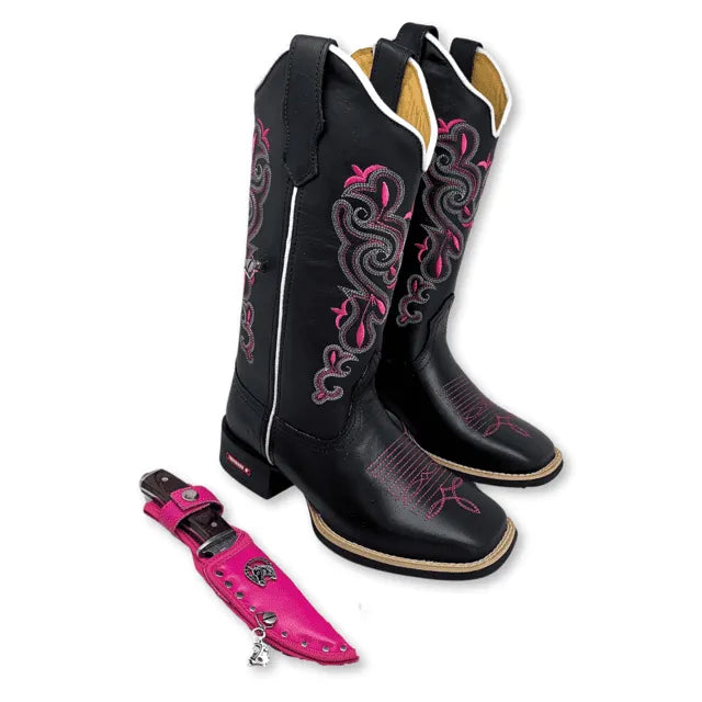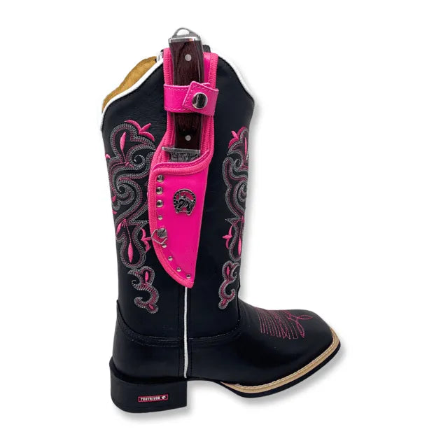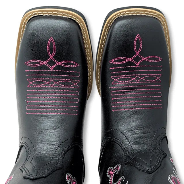 BotaFaca Heloisa 2.0\n - Couro Látego Preto | Bordado Branco e Rosa