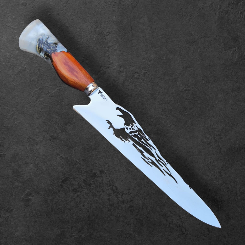 • Lâmina: 10 polegadas, em aço alemão forjado 420C, desenvolvido especificamente para cutelaria de alta performance, oferecendo cortes precisos e durabilidade extrema.