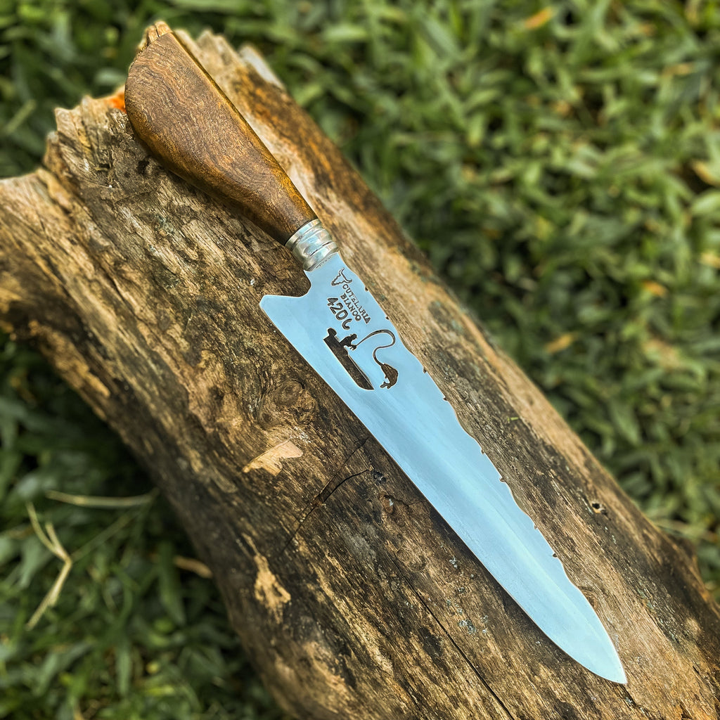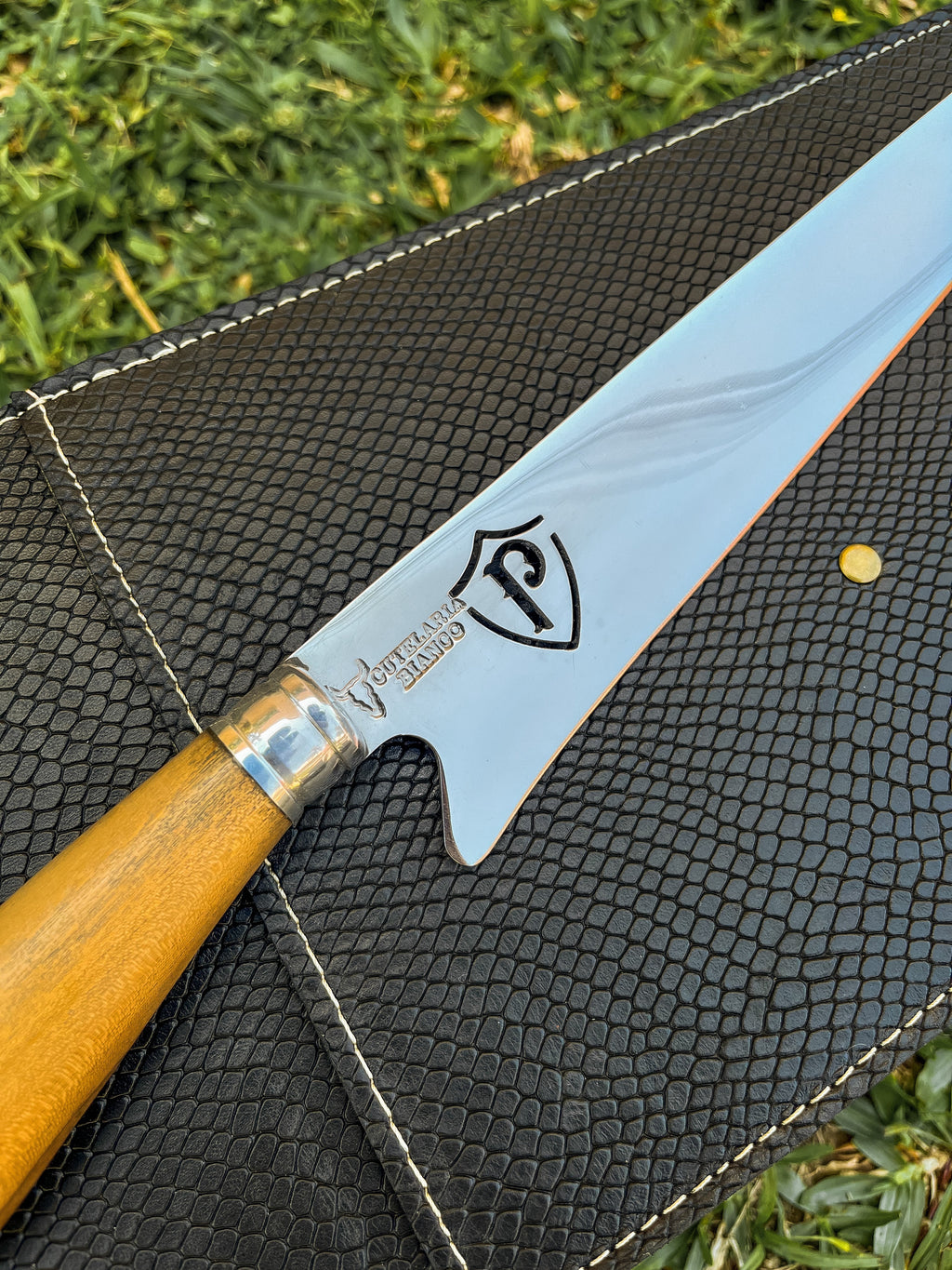 • Corte com Eficiência e Estilo: A faca de 10 polegadas, essencial para qualquer churrasco, oferece opções de modelos de lâmina, permitindo que você escolha a que melhor se adapta ao seu estilo de corte. O cabo em madeira não só é confortável como também adiciona um toque de elegância ao conjunto.